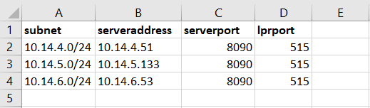 Get server address from CSV file: Select this if you wish MDC to automatically switch between multiple servers on an IP subnet. This is done by uploading a CSV file with the required information, by adding the exact path to the file in the CSV file path field, or by clicking ... and browsing for the file. In case the configuration for the current subnet does not match or something is incorrect on the file or it can't be opened, MDC will go to the disconnected state. The CSV file's headers should be subnet, serveraddress, serverport, and lprport, as seen on the image below.