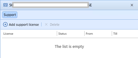 On the panel, click +Add support license. The Add support license dialog box appears. You have to manually activate the license, as described below.